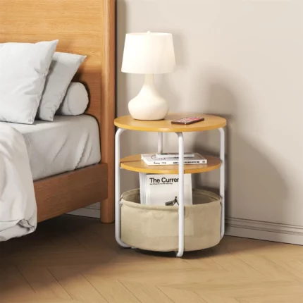 3-Tier Fabric Storage Round Computer Desk 40x60cm Metal Frame Wood Shelf Bedside End Table for Living Room Bedroom Office