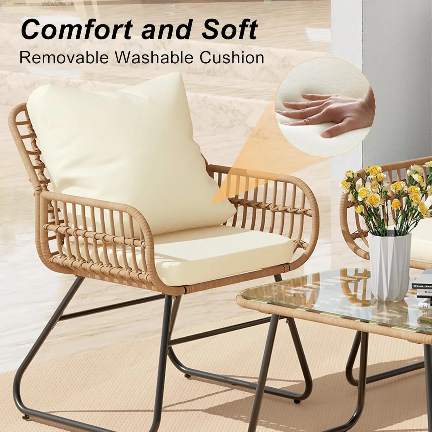 3 Pieces Outdoor Patio Wicker Furniture Set, Modern Rattan Chair Conversation Sets with Coffee Table for Yard and Bistro