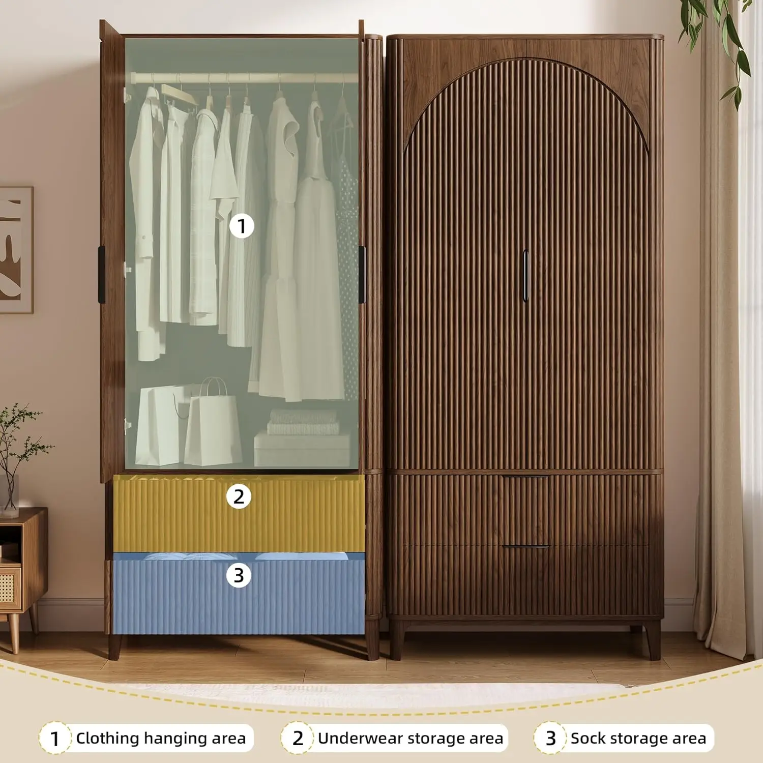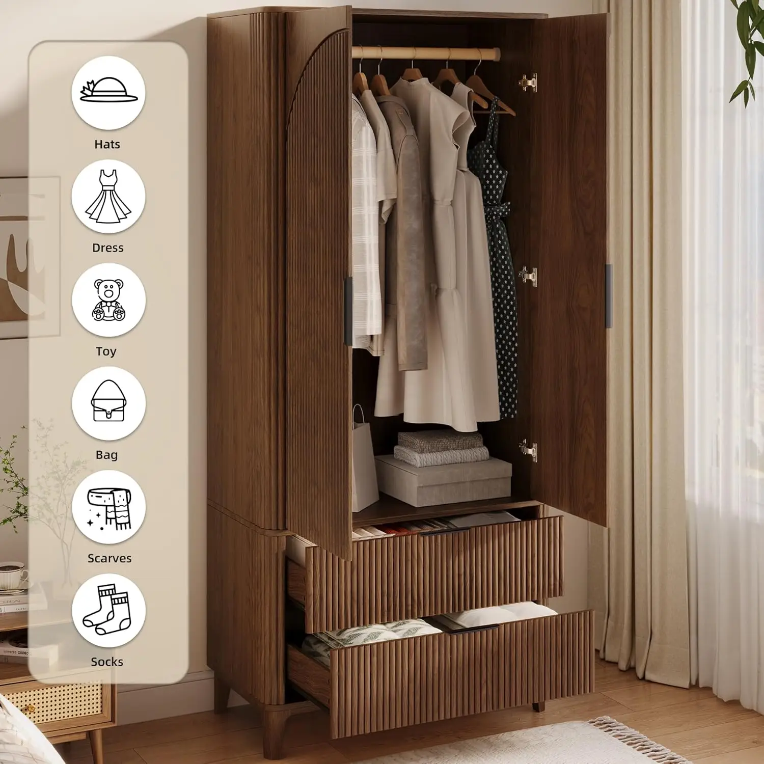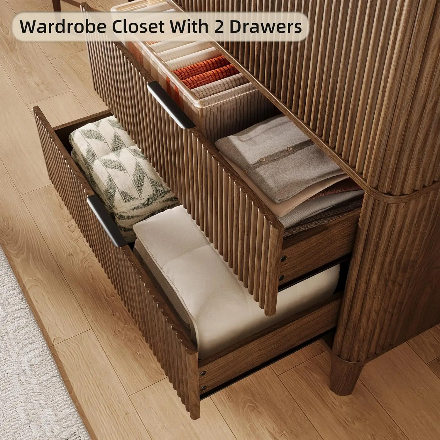 Fluted Wardrobe Closet Armoire with Doors And Drawers, Wardrobe Cabinet with Hanging Rack, Bedroom Closet Wood, Customized