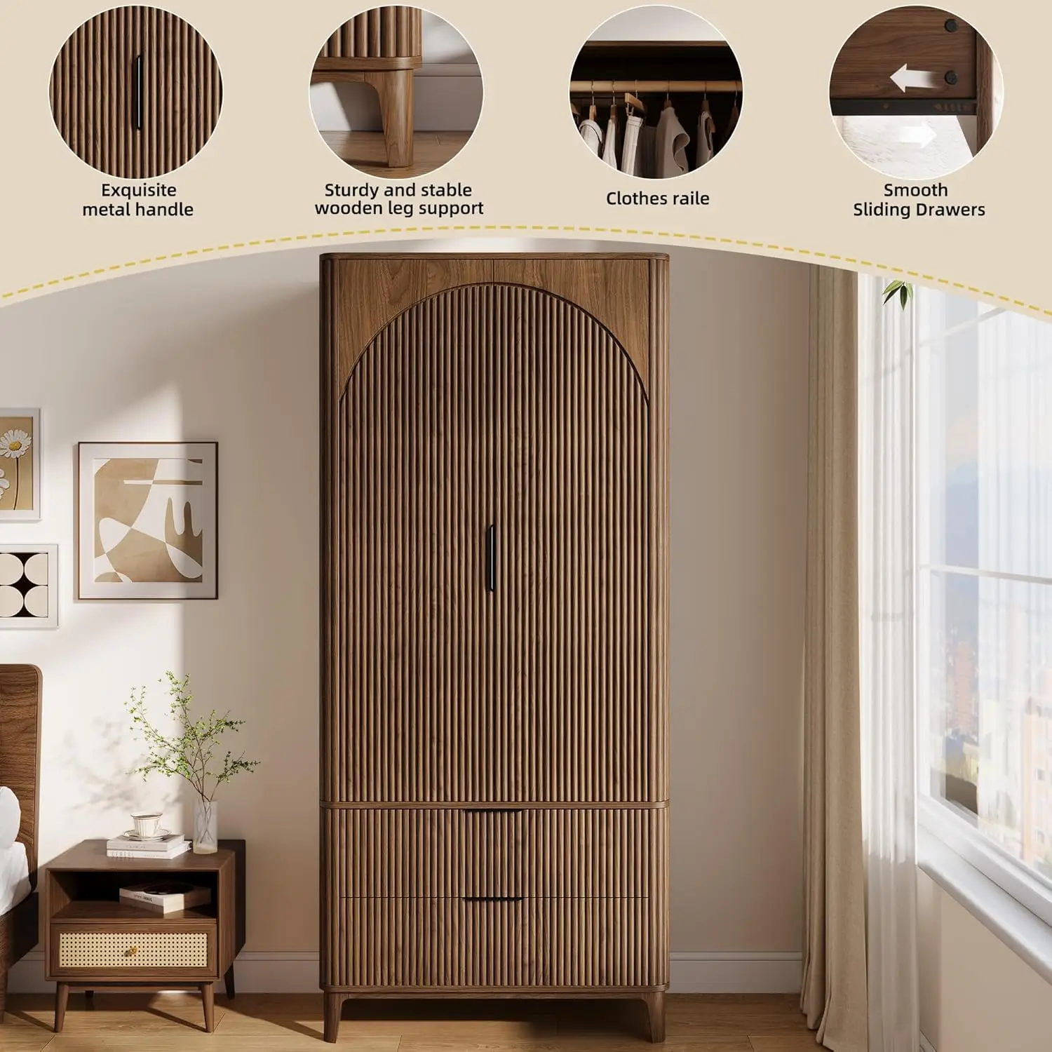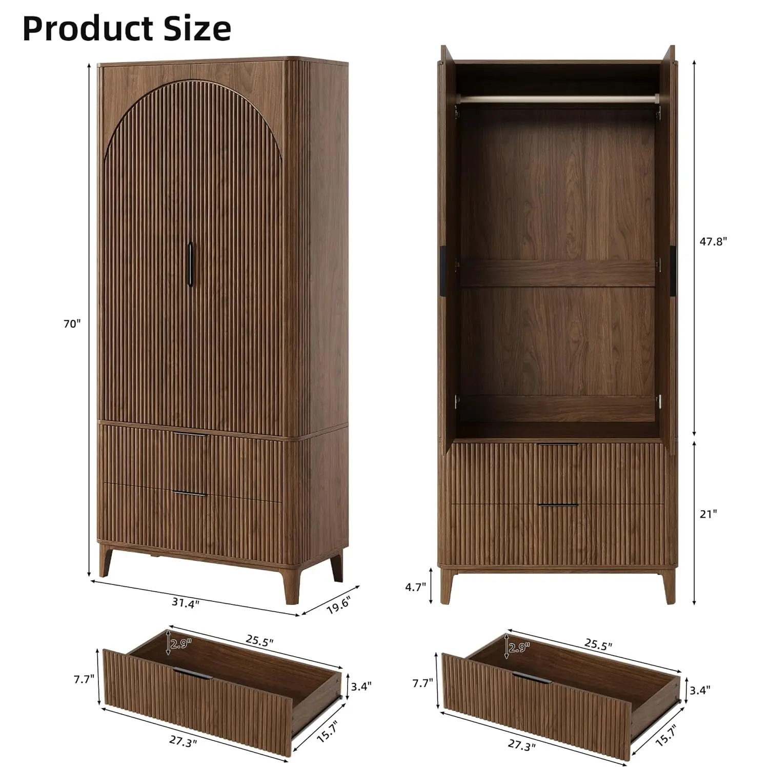 70.1″ Arched Wooden Armoire Wardrobe Closet with 2 Doors and 2 Drawers, Fluted Bedroom Armoire with Hanging Rod, Customized