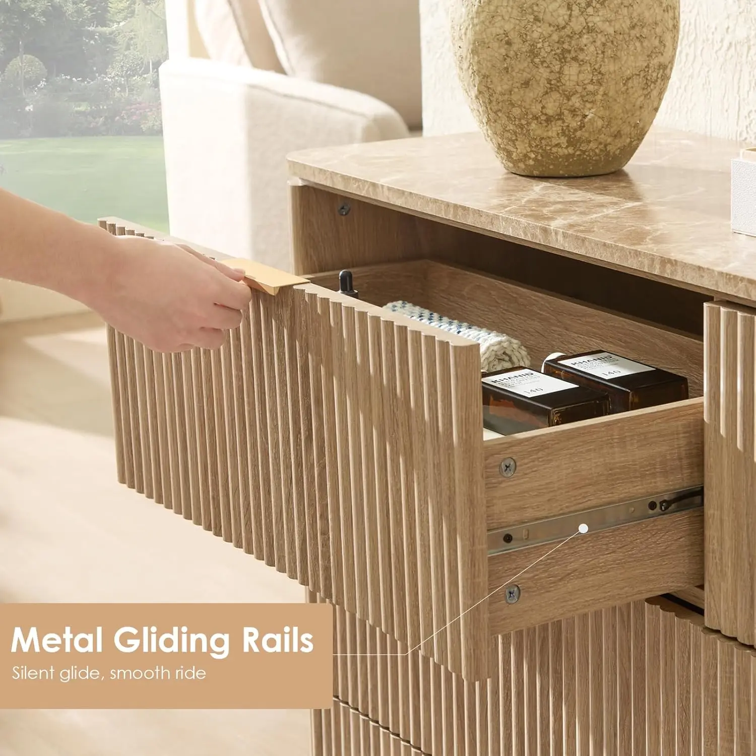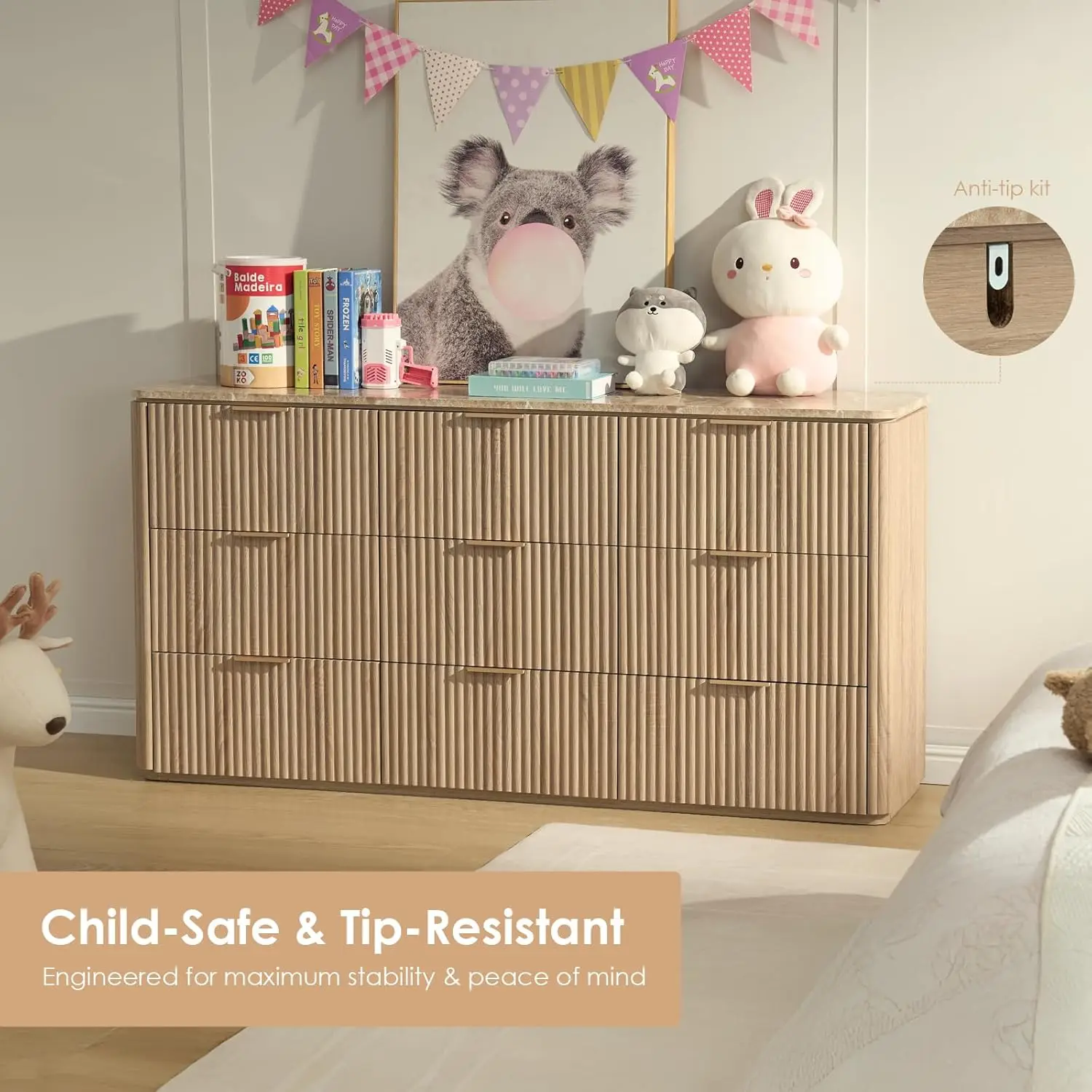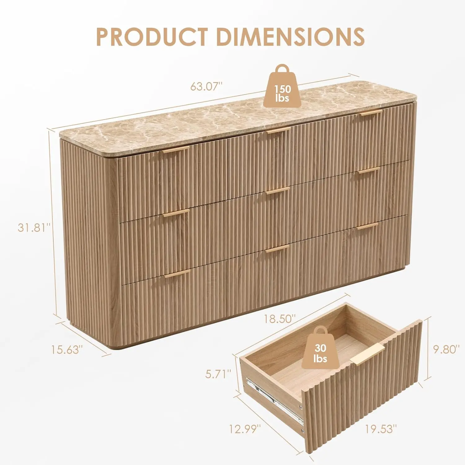 Fluted 9 Drawer Dresser for Bedroom, 63″ Wide Modern Chest of Drawers with Faux Marble Top, Curved Corners Design,, Customized