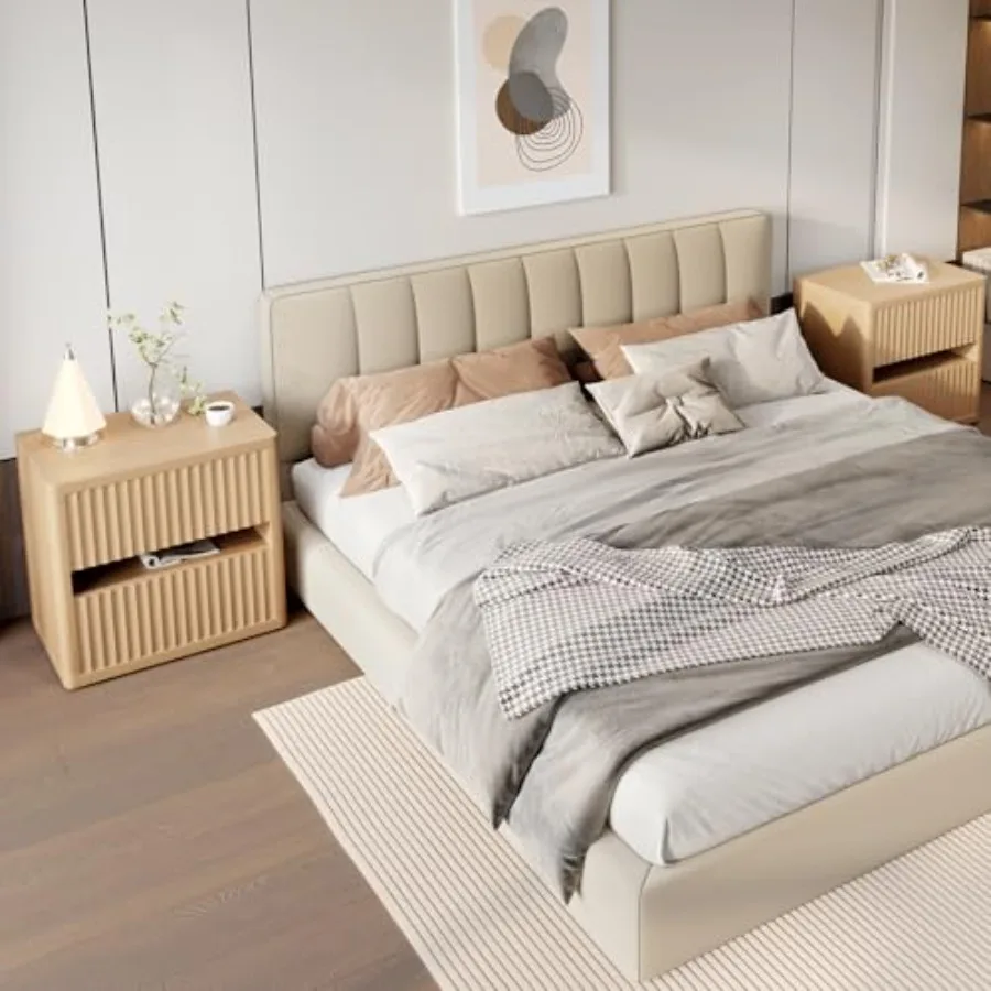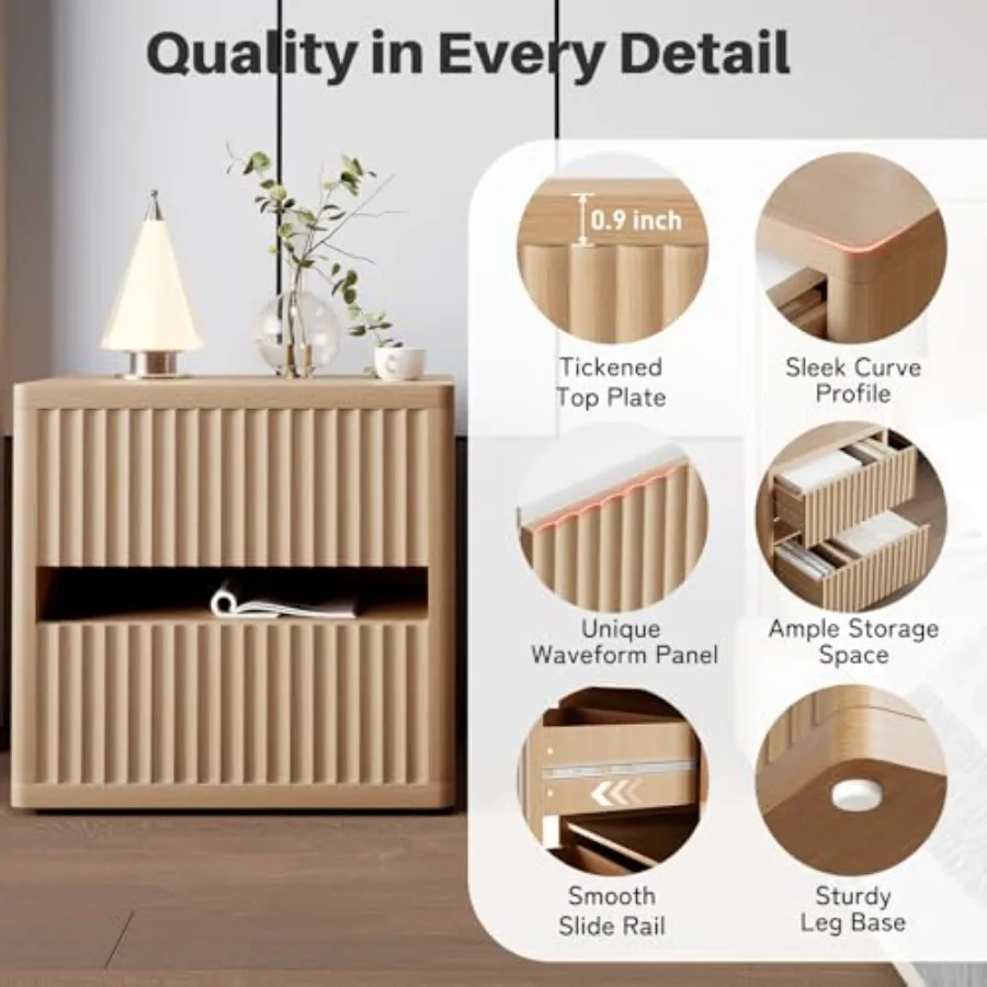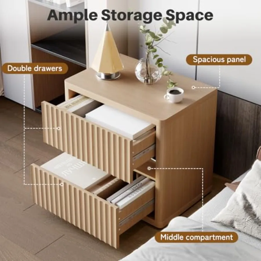 Home Bedroom Furniture Fluted Nightstand with 2 Drawers Large Wide Wood Night Stand Bedside Table for Bedroom Mid-Century Modern Storage Bed Side Tabl