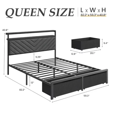 Queen Bed Frame with 2 Drawers, Upholstered Headboard with Storage and Charging Station, LED Lights, Fabric Drawers, Customized