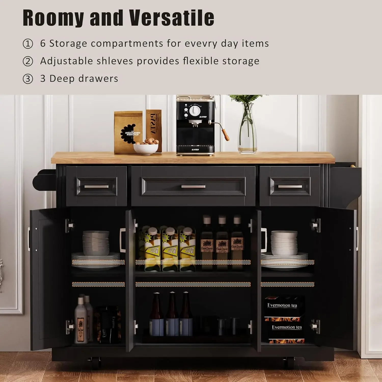 Be the first to review “Rolling Kitchen Island with Drop Leaf, 4 Cabinet Doors, 3 Drawers & Side Storage Racks, Mobile Kitchen Cart with, Customized” Cancel reply